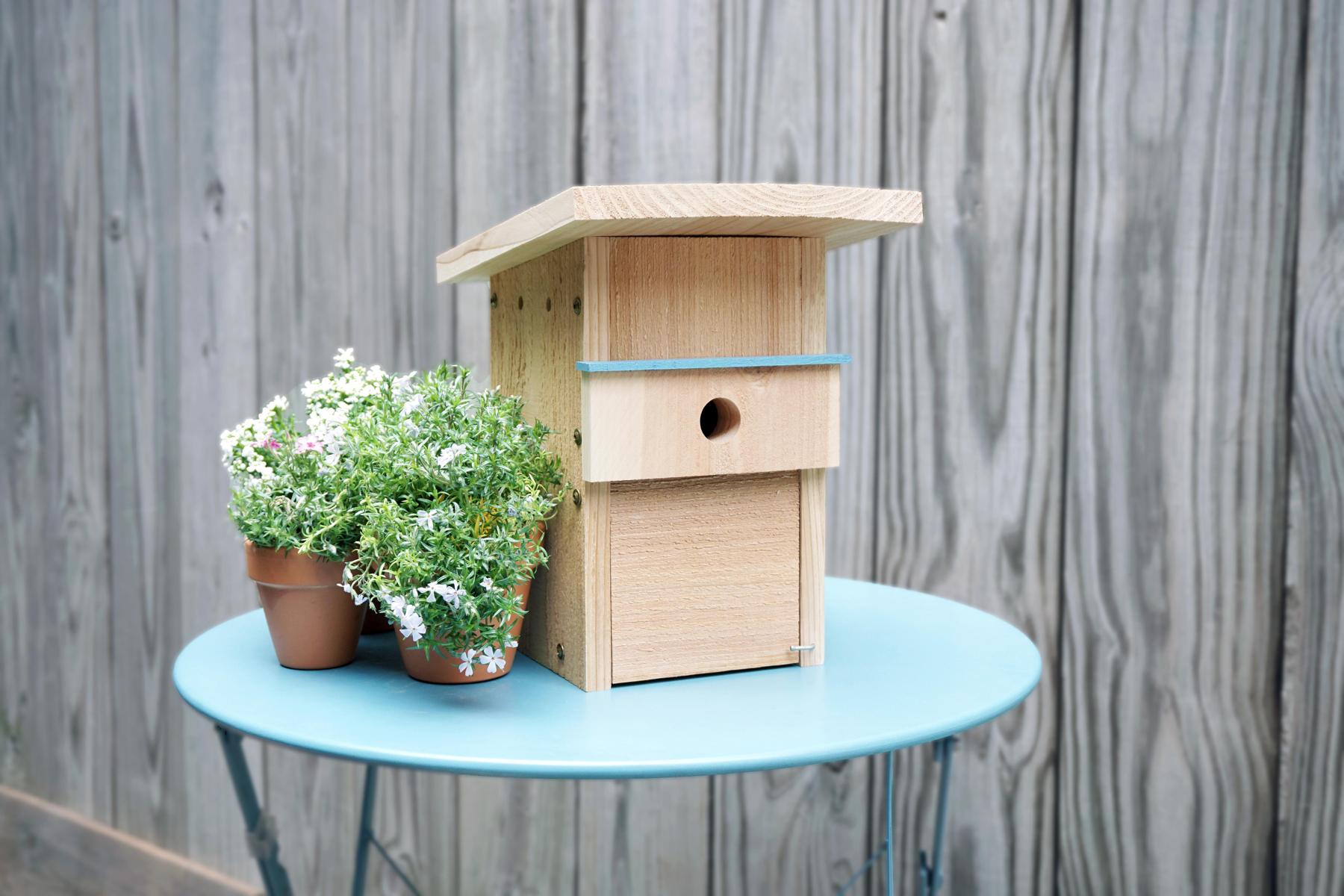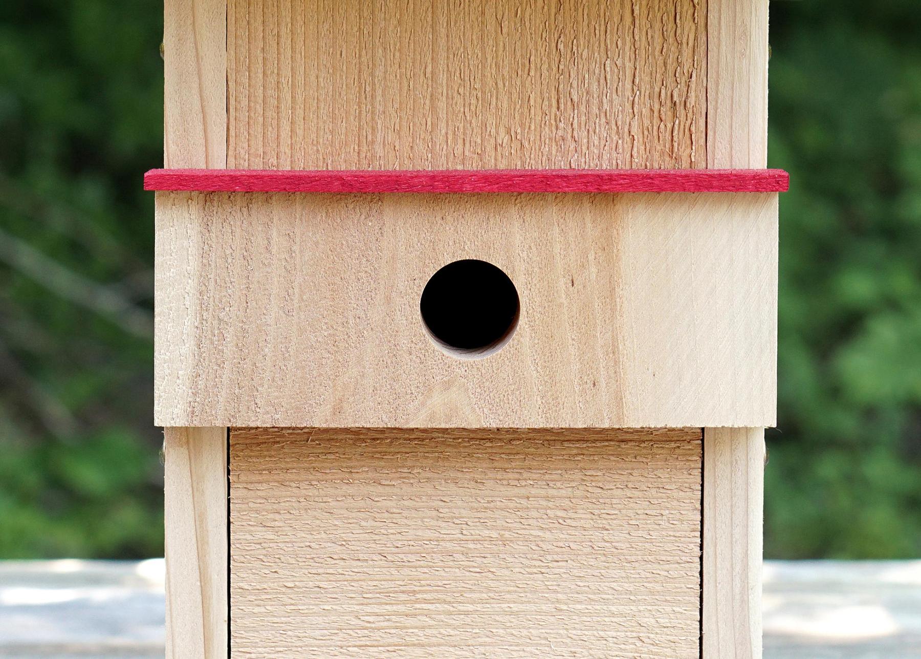 The Modern Birdhouse features an integrated predator guard and color accent. This birdhouse has an 1 1/4" entry hole for use with chickadees, wrens, titmice, and nuthatches. Minimal use of low-voc paint emulates a natural environment for birds while the clean lines form a modern aesthetic. The Modern Birdhouse is constructed of weather-resistant cedar, exterior screws, and non-toxic glue.